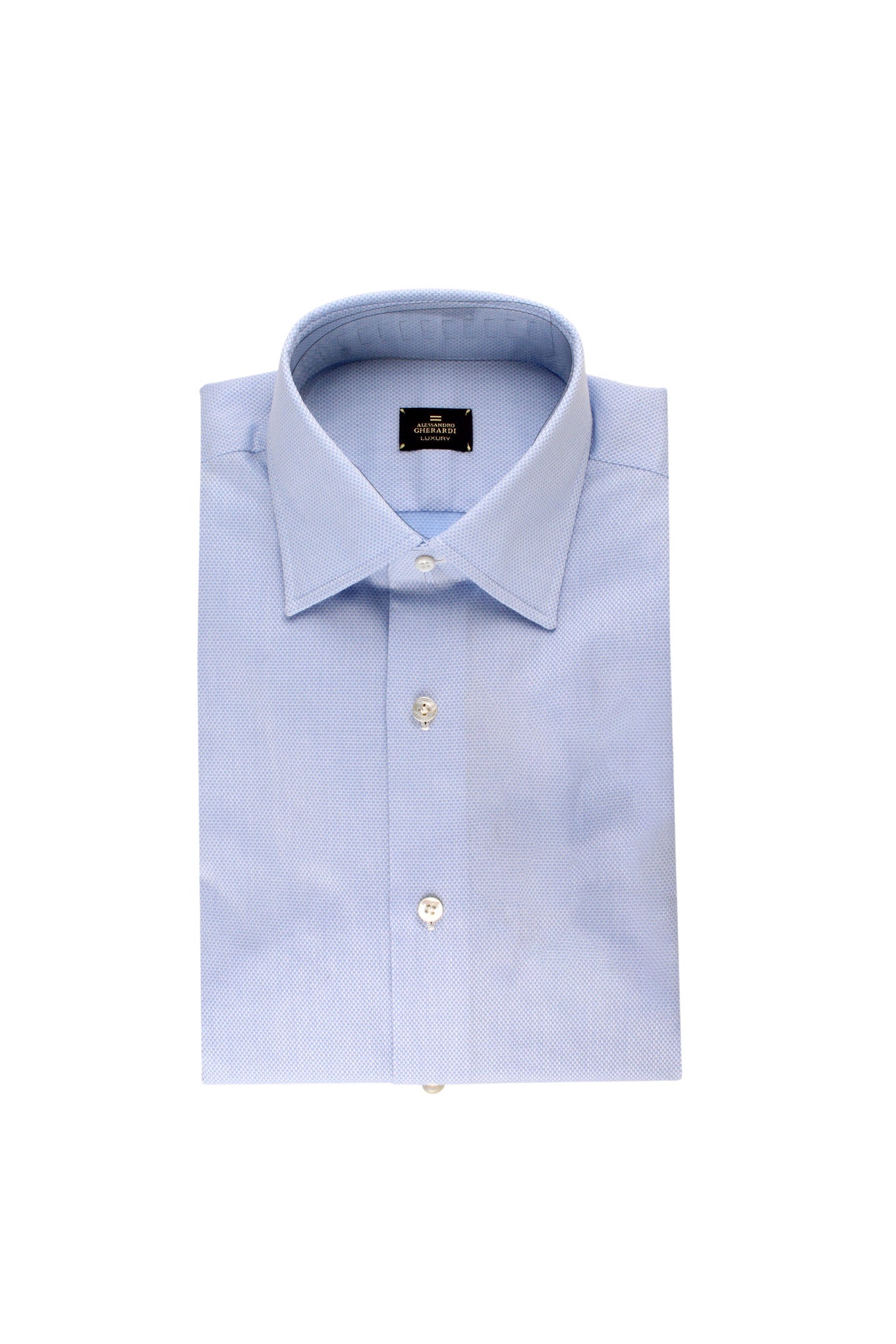Part of the Alessandro Gherardi Luxury line, this shirt is crafted from premium Italian cotton with an elegant micro-texture in refined light blue. The sleek spread collar, polished buttons, and impeccable cut define sophistication at its finest — a wardrobe essential for the modern gentleman.