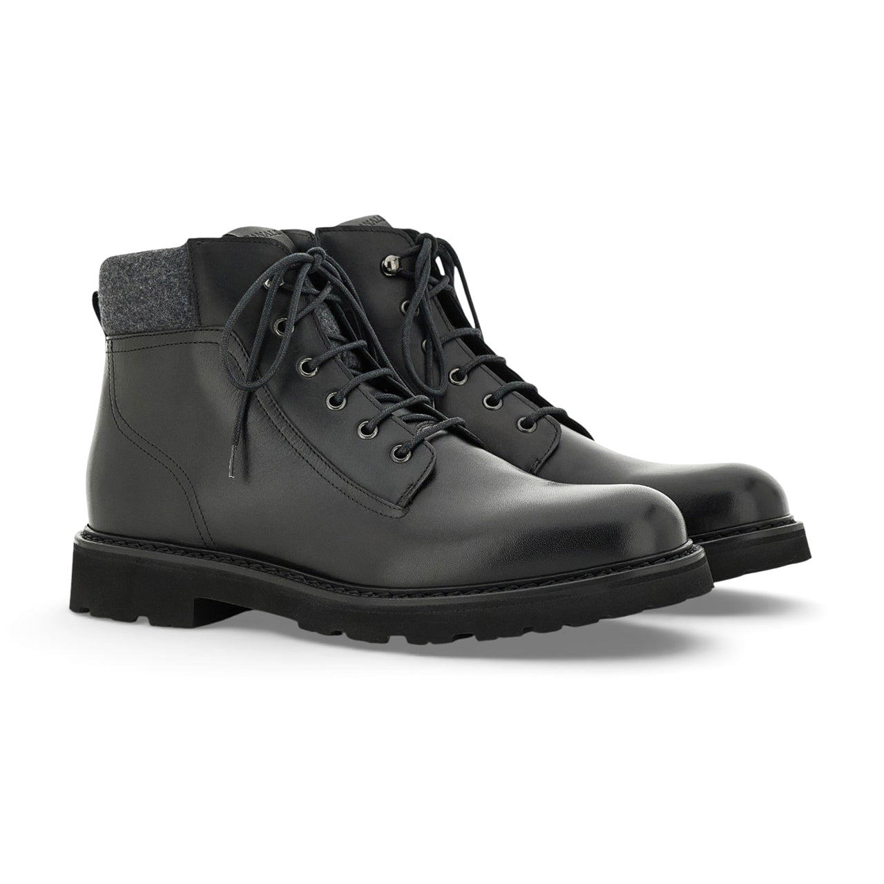 Calfskin ankle boot with wool padded ankle detail and lug sole. The rivets and hot-stamped logo emphasise the excellence of the craftsmanship, while the combination of materials combines sturdiness and comfort for a contemporary and functional style. - Lace-up ankle boot - Eva lug sole - Canali rivet - Hot-stamped Canali logo - Needlework design - 80% cowhide leather, 20% wool - Made in Italy