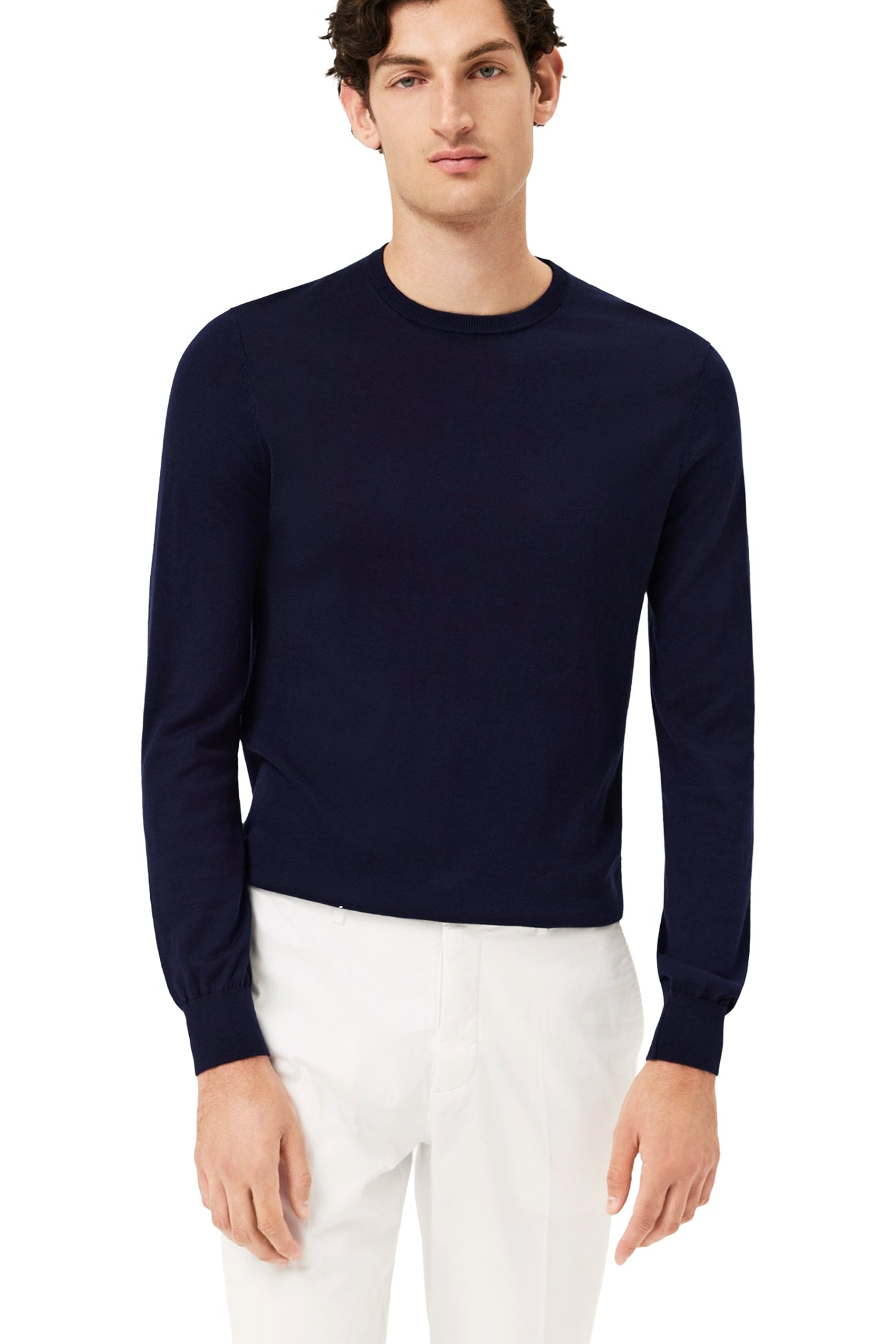 Long-sleeve crew neck sweater knitted from a refined cotton and silk blend. Designed with ribbed finishes at the collar, cuffs, and hem. Fully fashioned at the shoulder seams and armholes for a clean, structured fit. WINTER 25 SACOOR - Sweater Man Casual (Regular) - - Material: 70% Cotton 30% Silk Collar Type: Round Collar Sweater Gauge: Gauge 12-14