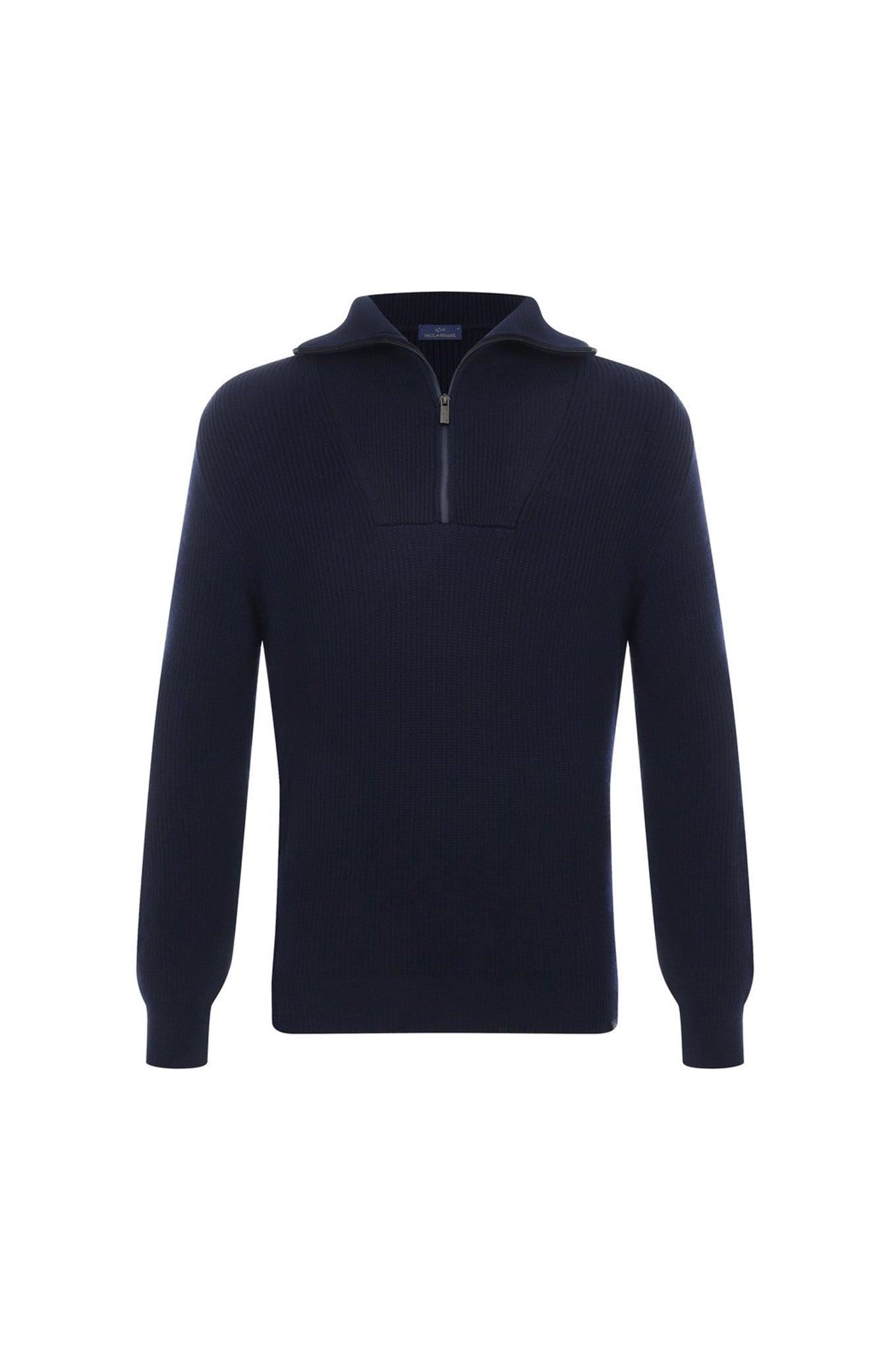 This straight-cut sweater is knit in a ribbed pattern using wool yarn. It features the signature miniature Shark tag patch at the hem and a zippered high collar. Wool: 100%