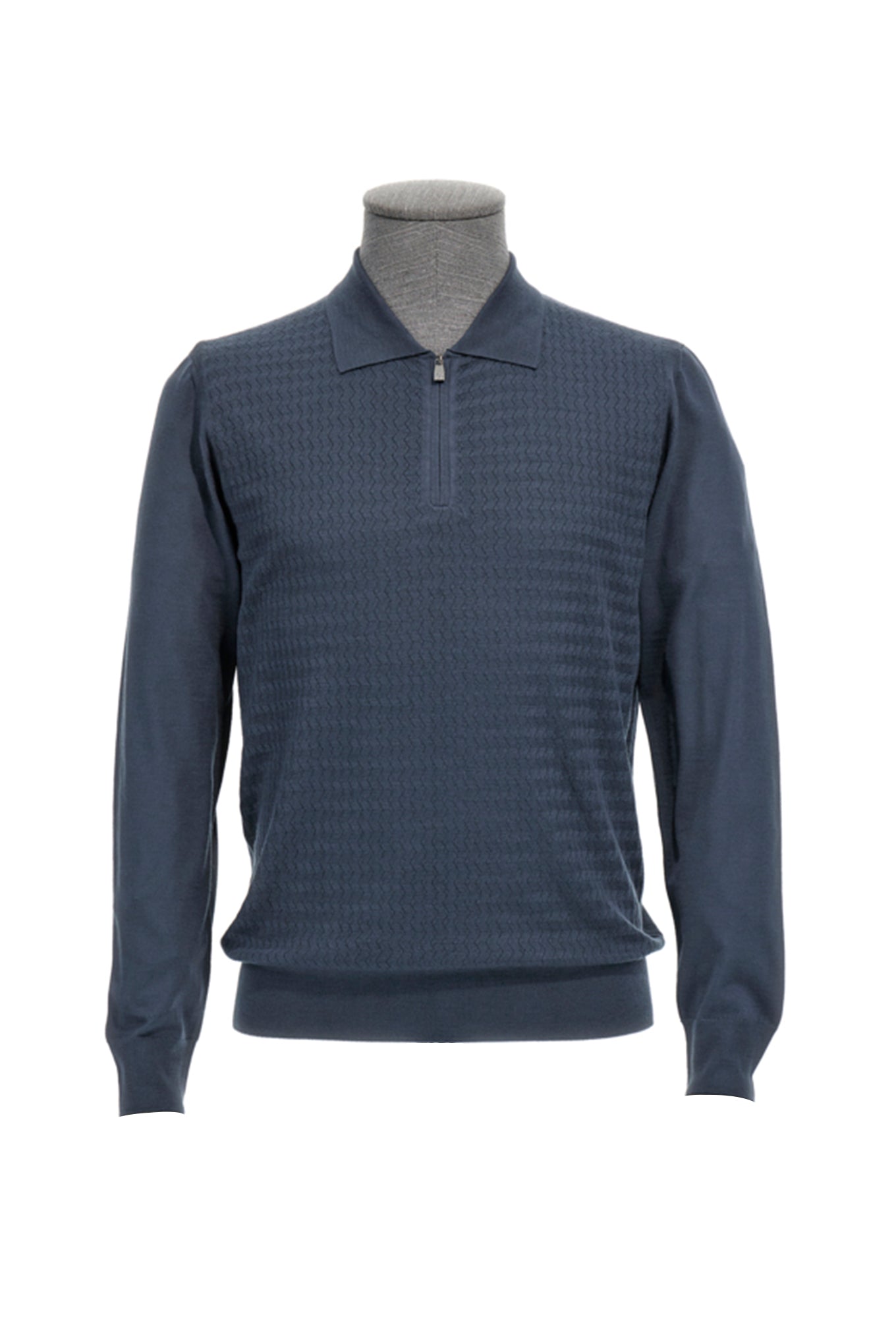 Refined and versatile, this midnight blue long-sleeve sweater features a subtle woven texture across the front panel, adding depth and understated character to its clean silhouette. Designed with a classic polo collar and a sleek half-zip closure, it blends smart tailoring with modern comfort. The smooth sleeves and ribbed hem ensure a structured yet comfortable fit, making it ideal for both business-casual settings and elevated everyday wear. Crafted for effortless sophistication, this piece pairs seamlessly with tailored trousers or premium denim for a polished look.