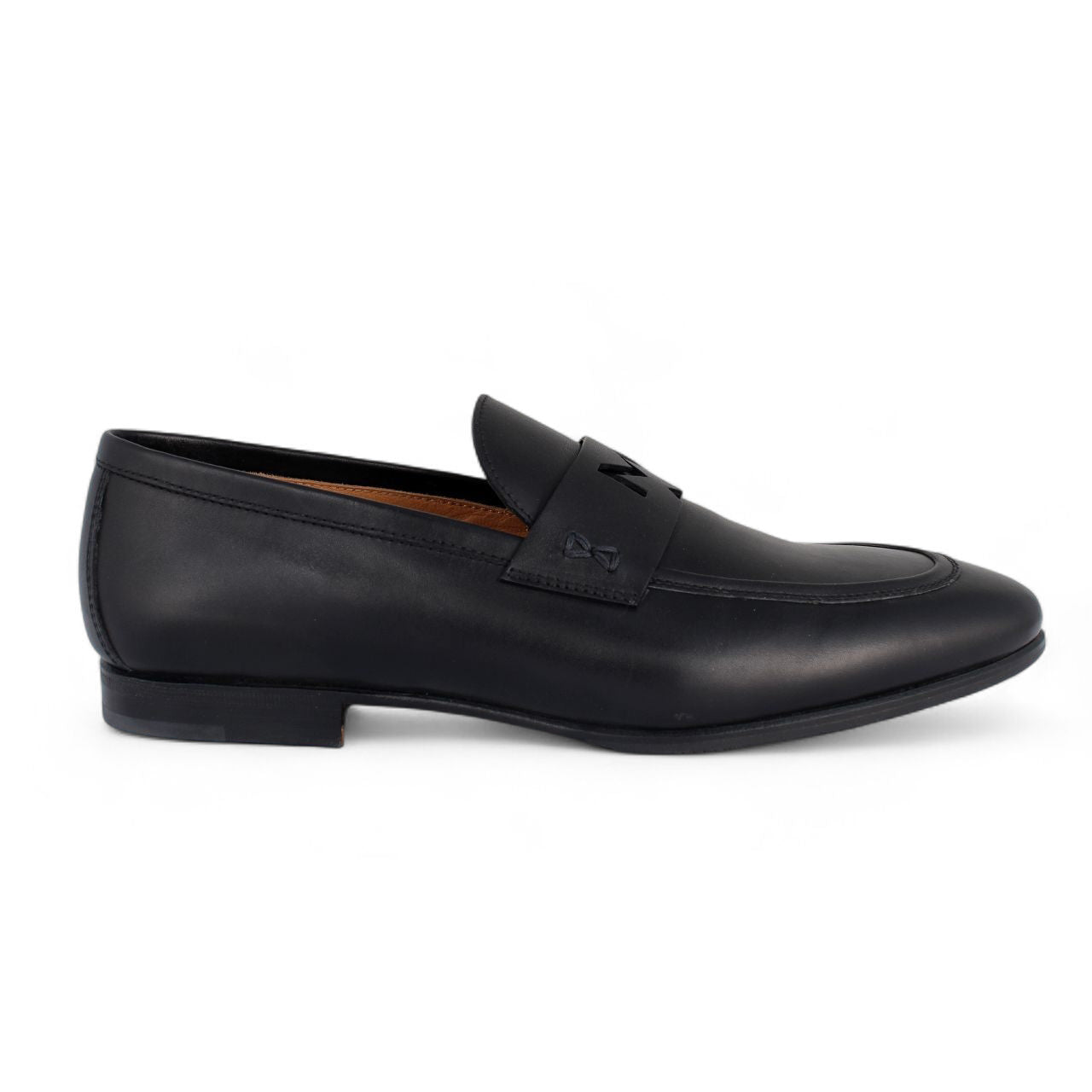 Minimalist yet distinct, the Forlì Signature Loafer is crafted from smooth black calfskin and elevated by the bold "M" emblem strap. The unlined interior and flexible leather-rubber sole ensure day-long comfort, while the clean silhouette makes it perfect for both business casual and refined evening wear.