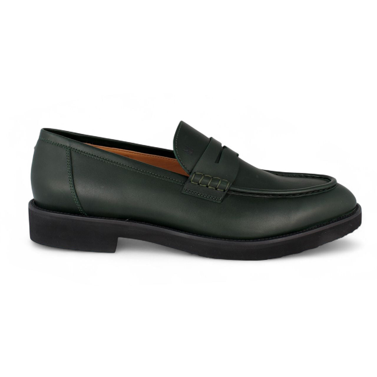 A refined take on classic Italian elegance, the Genova penny loafer is crafted in deep forest green calf leather with a smooth matte finish. Featuring a sleek almond toe, minimalist stitching, and a cushioned black rubber sole, it blends timeless style with modern versatility. Perfect for spring and autumn wear, whether dressed up with tailored trousers or down with smart denim.