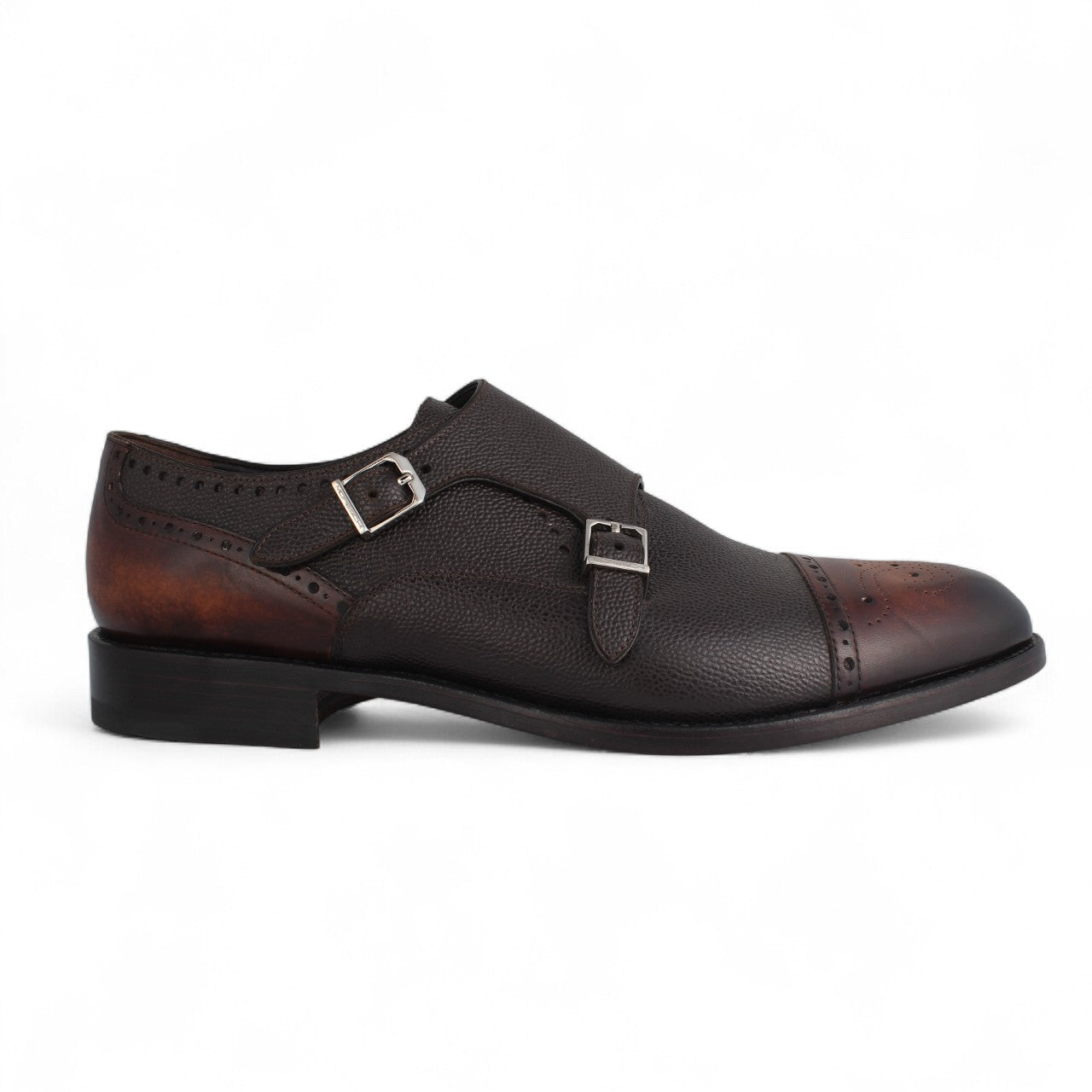 The Pordenone Double Monk is a refined blend of texture and craftsmanship. Crafted from rich brown pebbled leather with a hand-polished patina toe, it exudes timeless sophistication. The dual silver buckles highlight Moreschi’s heritage of artisanal detail, while the leather sole and brogued cap toe deliver a perfect balance of character and elegance — ideal for the modern gentleman who values distinction.