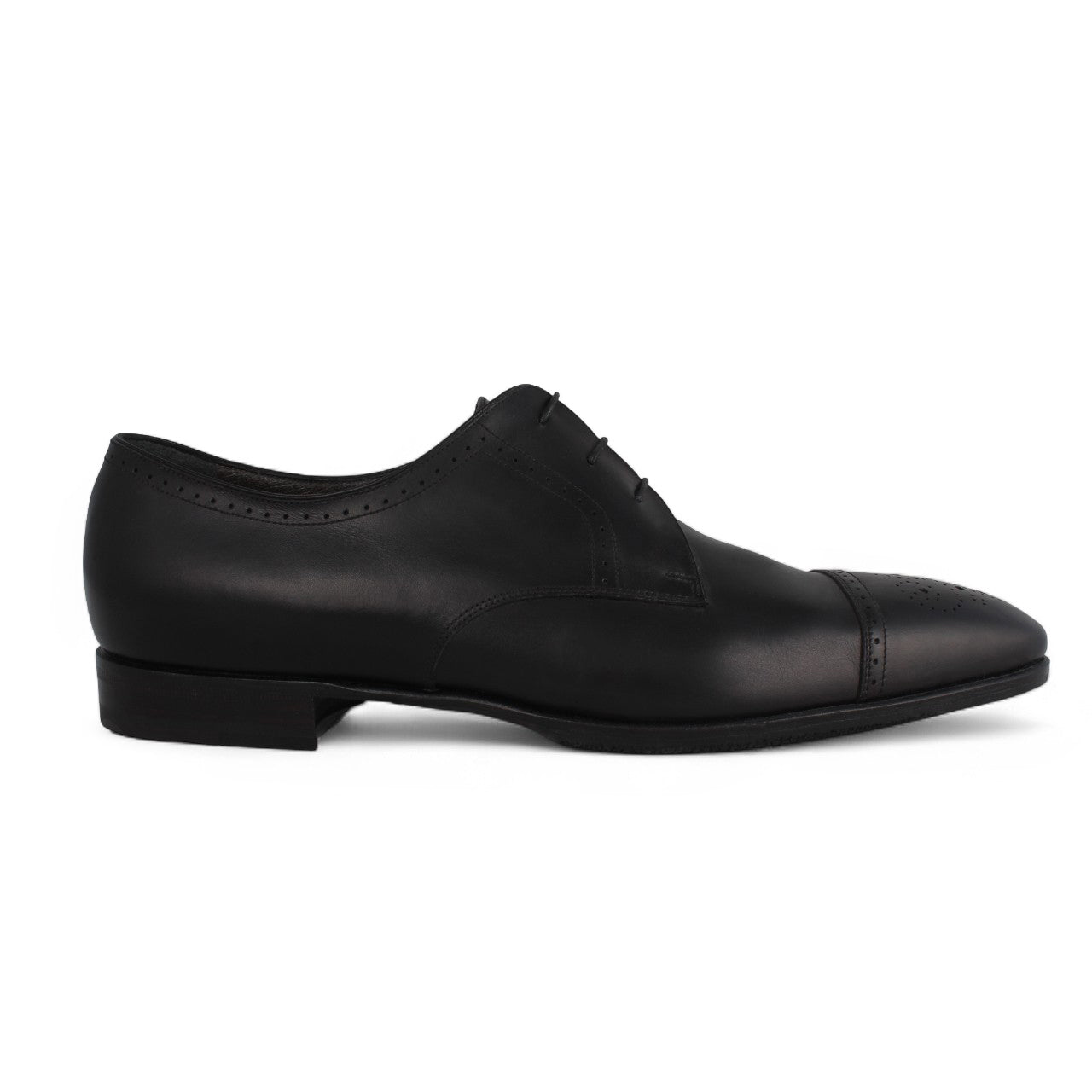 Crafted from smooth premium leather, the Moreschi Tivoli Cap Toe Derby embodies refined Italian elegance with a timeless silhouette. Designed with a classic cap-toe featuring subtle perforation details, this model delivers a clean, sophisticated look suitable for formal and business occasions. The lace-up construction ensures a secure fit, while the leather outsole provides durability and comfort for extended wear. A versatile essential that pairs effortlessly with tailored suits and polished ensembles.