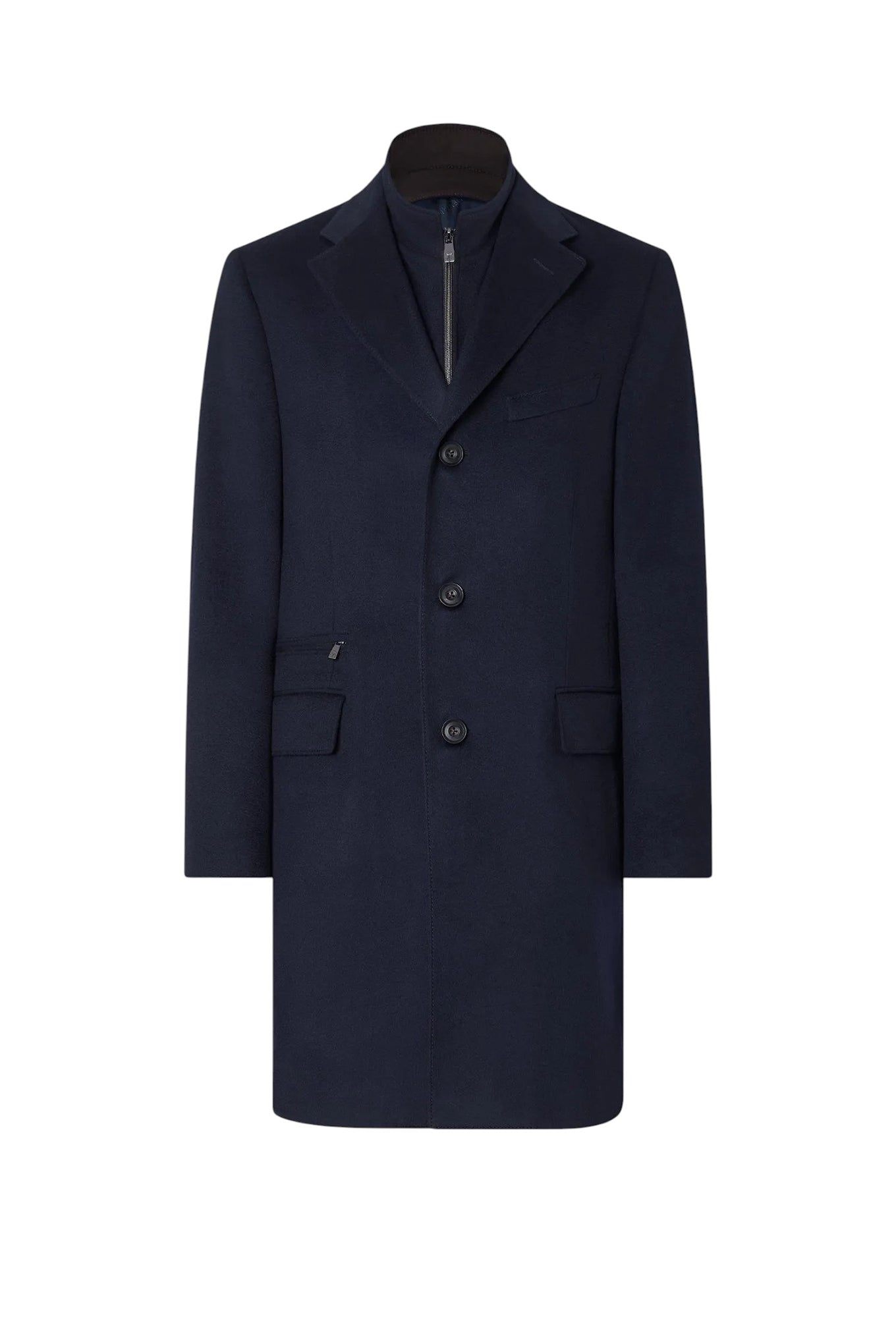 A synthesis of classic elegance and modern functionality, this single-breasted pure virgin wool coat, proposed in a sophisticated dark blue, is enriched with a detachable inner vest made from refined microsuede, ideal for adjusting comfort and protection according to the season. The notch lapels with frog fastener and flap ticket pocket add distinctive sartorial details, while the flapped side pockets enhance practicality. The regular fit and 95 cm length complete a contemporary silhouette, perfect for facing the coldest months in style.
