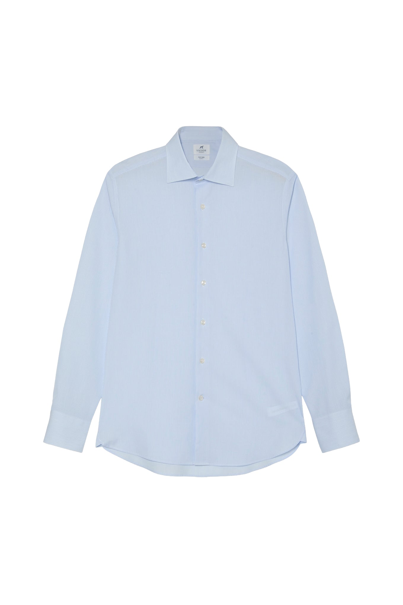 This long-sleeve shirt is cut in a slim fit from poplin fabric with a refined stripe pattern, offering lightweight comfort, refined structure, and subtle texture. It features an Oxford collar, single placket, and standard cuffs. The shirt includes a discreet pleat on the sleeve, triangle inserts at the side seams in self-fabric, a horizontal last buttonhole in contrast thread, and off-white buttons. Detailed with removable collar stays and reinforced construction for durability. Available in regular fit sizes starting from size 44. This shirt is perfect for office wear and any occasion where a sharp look matters.