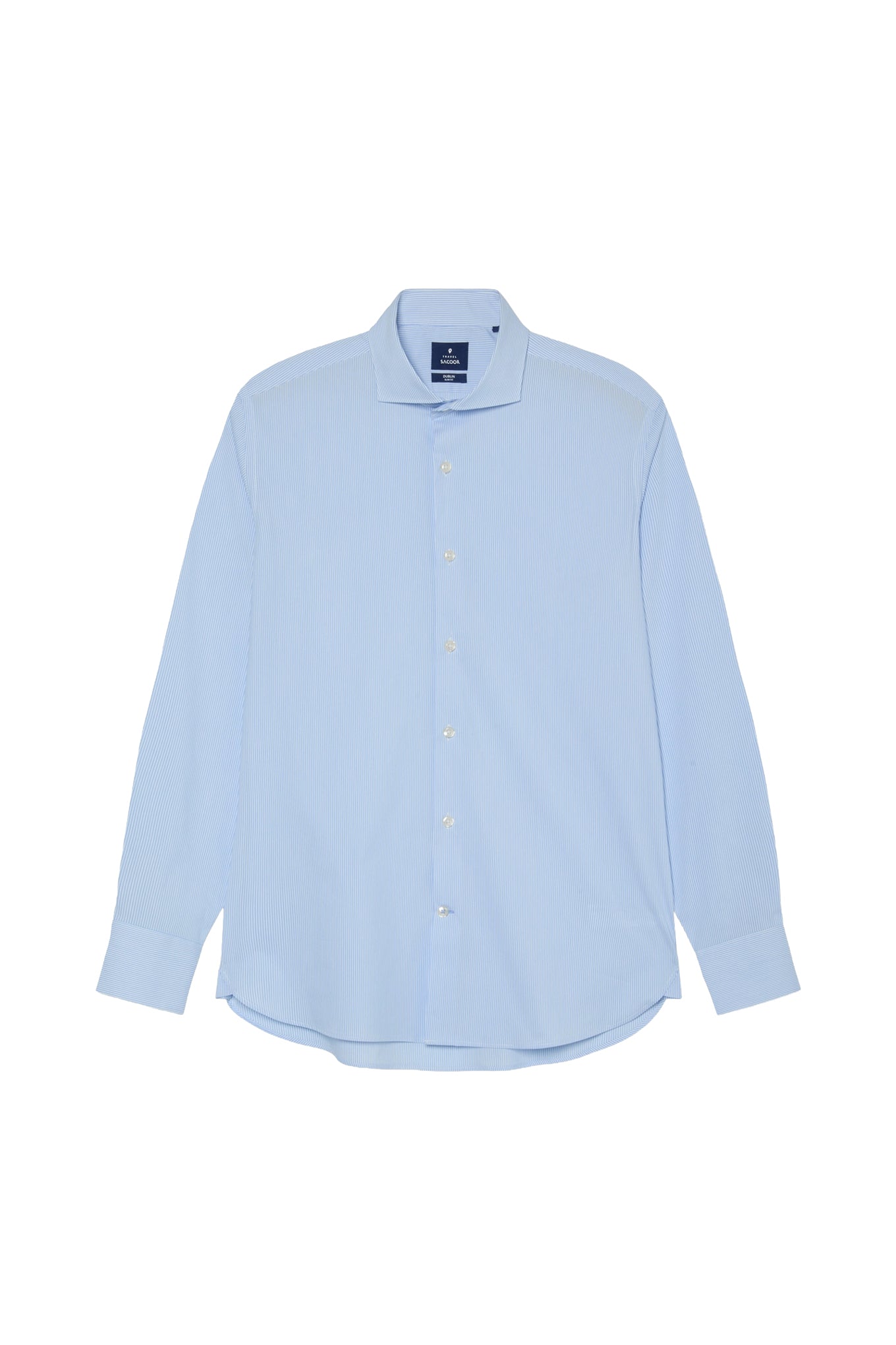 This long-sleeve shirt is cut in a slim fit from a travel-quality poplin blend with a refined stripe pattern, offering lightweight comfort and sharp structure. It features a Dublin collar, single placket, and standard cuffs. The shirt includes a discreet pleat on the sleeve, triangle inserts at the side seams in self-fabric, a horizontal last buttonhole in contrast thread, and off-white buttons. Detailed with removable collar stays and reinforced construction for durability. Available in regular fit sizes starting from size 44. This shirt is perfect for office wear and any occasion where a sharp look matters.