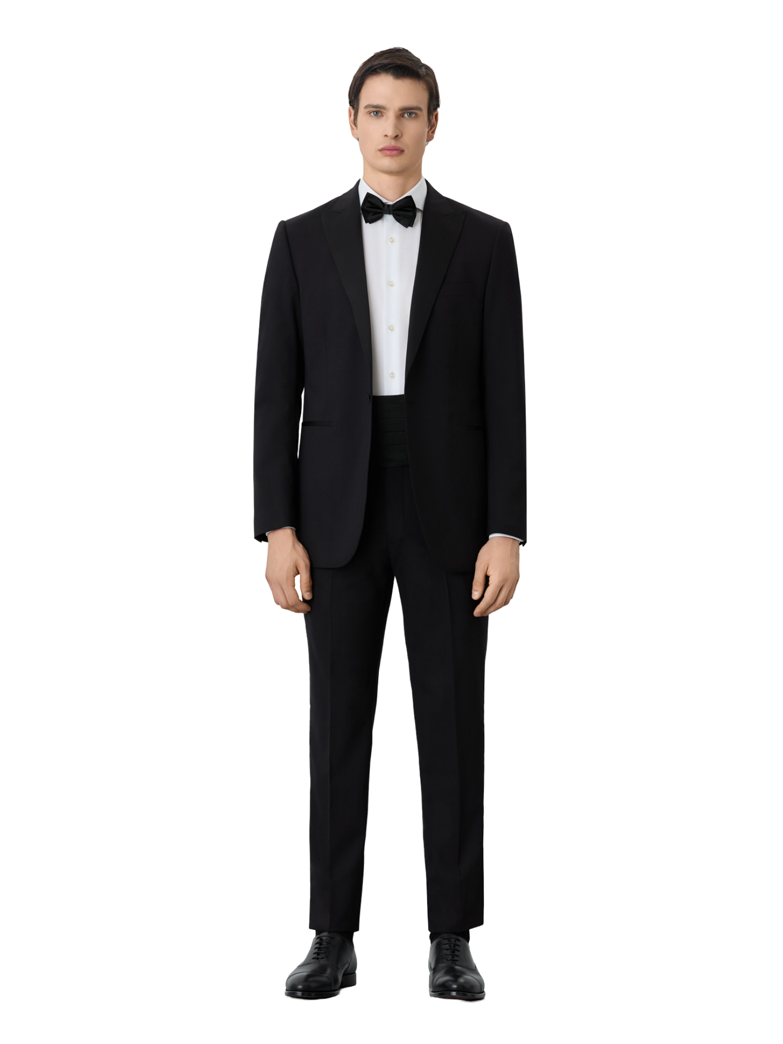 Party line K-easy tuxedo suit expertly tailored from wool and elastane blend. Features a blazer with satin peak lapels. One-fabric button fastening and four-button detail on the sleeves, two side welt pockets, a chest pocket, three interior pockets and two openings on the back. Trousers with zip and invisible button fastening. Features waist with belt loops. Satin side detail. This tuxedo is a party piece that will earn you sartorial points season-after-season. All suits have regular fitting measures from sizes 56 to 62. SUMMER 24 SACOOR - Tuxedo Man Classic (Slim) Material: 96% Wool 4% Elastane